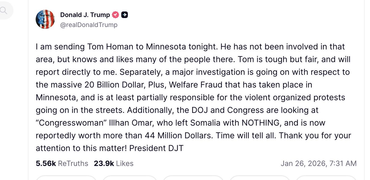 The statement and image involve a public figure discussing an investigation and actions related to Minnesota, touching on issues of welfare fraud and political figures. It implies a connection between financial fraud and social unrest, and mentions a specific congresswoman in a potentially accusatory manner.