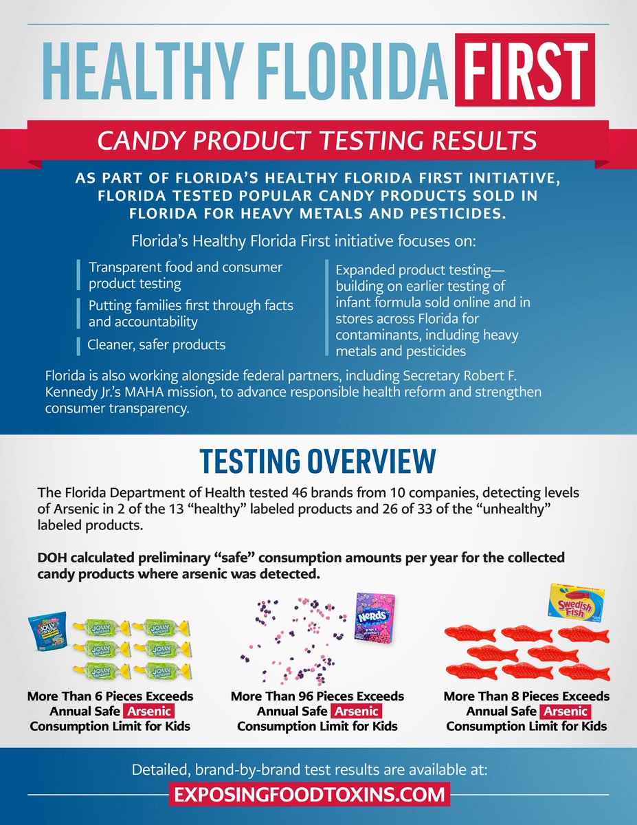 The statement and accompanying image focus on the need for transparency and reliable information regarding food safety, specifically concerning candy products in Florida. It highlights the efforts of the Healthy Florida First initiative to test products for contaminants like heavy metals and pesticides, aiming to protect public health. The tone is informative and advocates for consumer rights and safety.