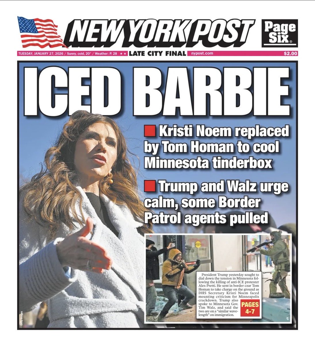 The New York Post front page addresses a political issue involving Kristi Noem, Tom Homan, and tensions in Minnesota. The headline 'ICED BARBIE' could be seen as derogatory, potentially undermining the dignity of the individuals involved. The content appears to focus on political actions and responses to a crisis, which is relevant to public discourse.