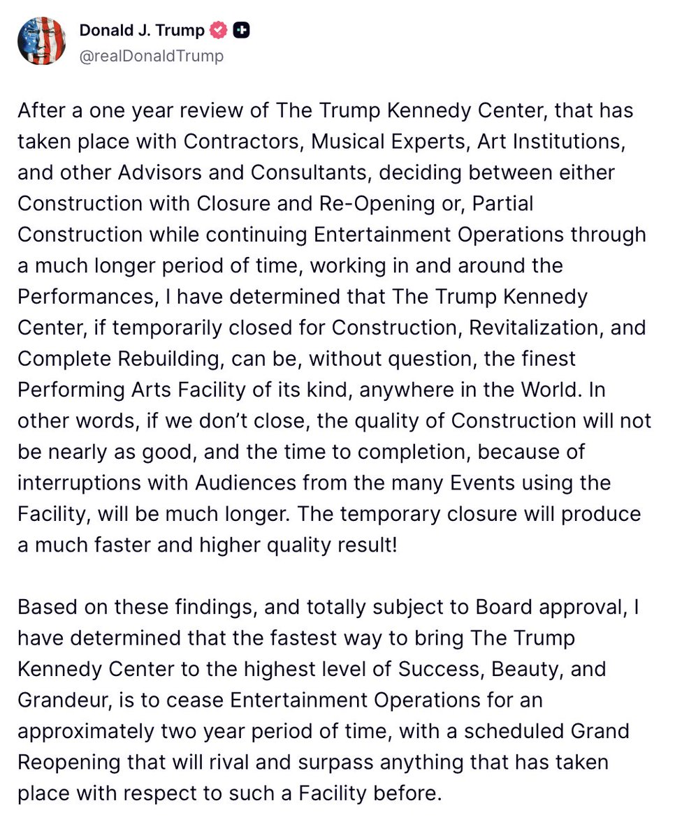 The statement discusses the closure and renovation of the Kennedy Center, emphasizing improvements and future benefits. It aims to inform the public about the decision and its expected positive outcomes.