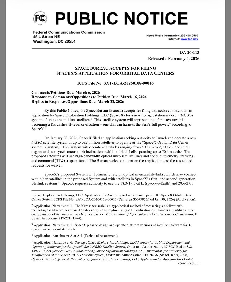 The FCC welcomes and now seeks comment on the SpaceX application for Orbital Data Centers.