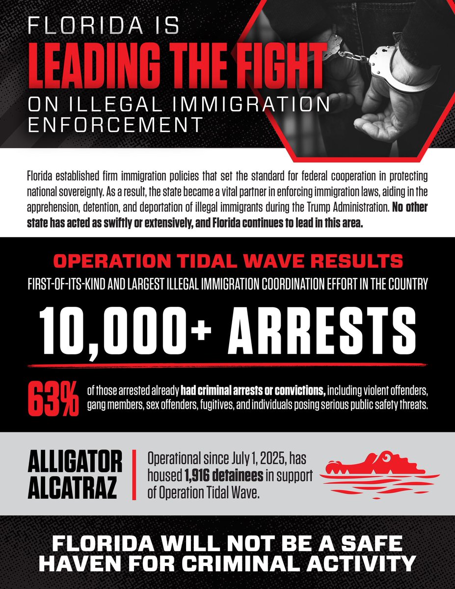 In April 2025, Florida partnered with federal law enforcement in the largest joint immigration enforcement operation in ICE’s history: Operation Tidal Wave.